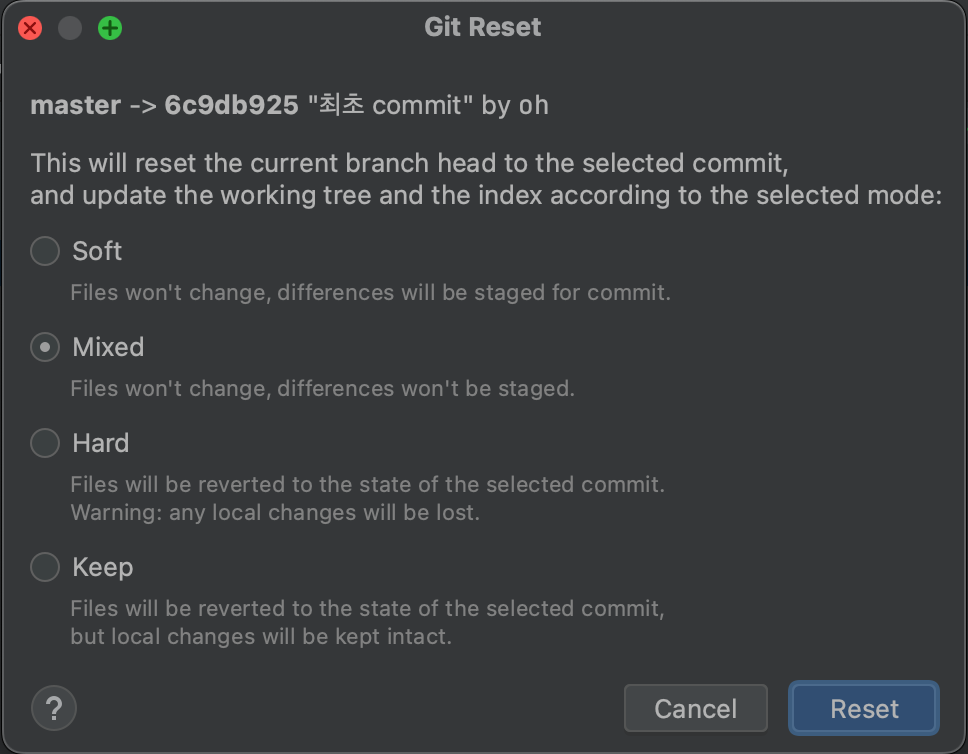 - 방식: reset 명령어는 --soft, --mixed, --hard 세 가지 옵션을 제공합니다.