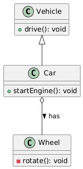 여기서 Car는 Vehicle로부터 상속받고, Wheel과는 집합 관계를 가집니다.
