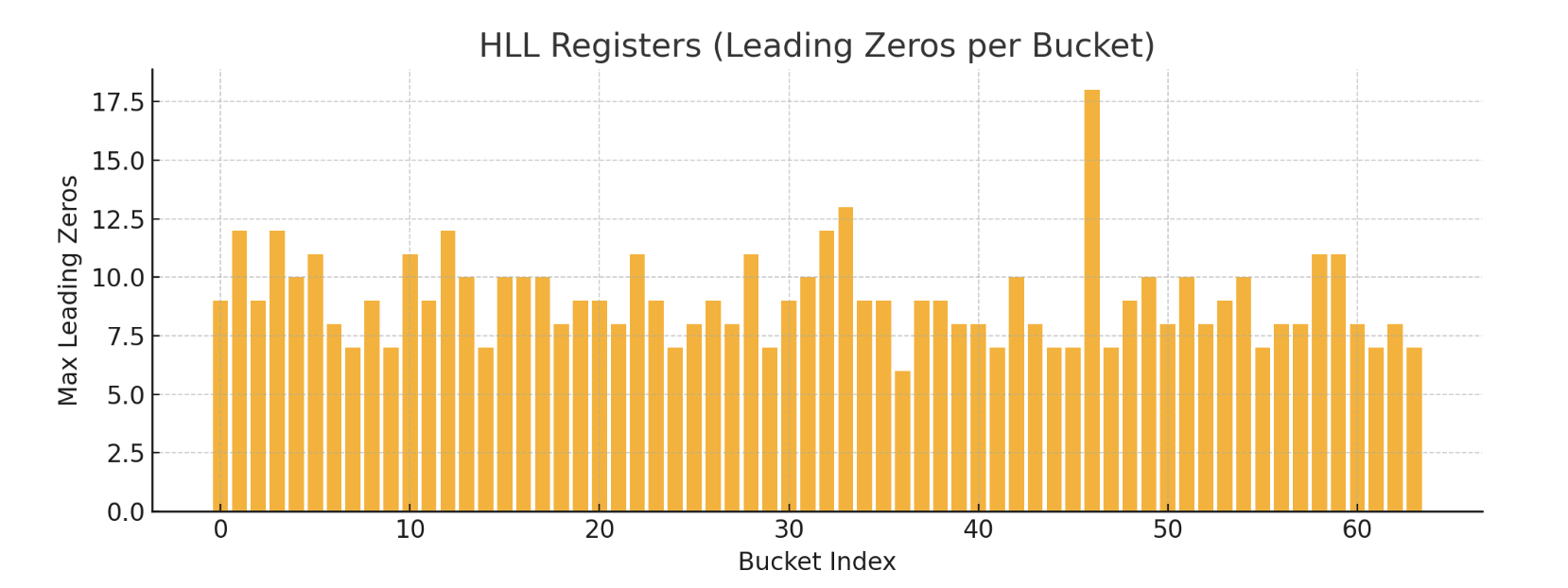 그래프는 각 버킷이 저장한 "가장 긴 leading zeros" 값을 나타낸 것으로, 분산된 해시값들이 어떻게 카디널리티 추정에 기여하는지를 시각적으로 보여줍니다.