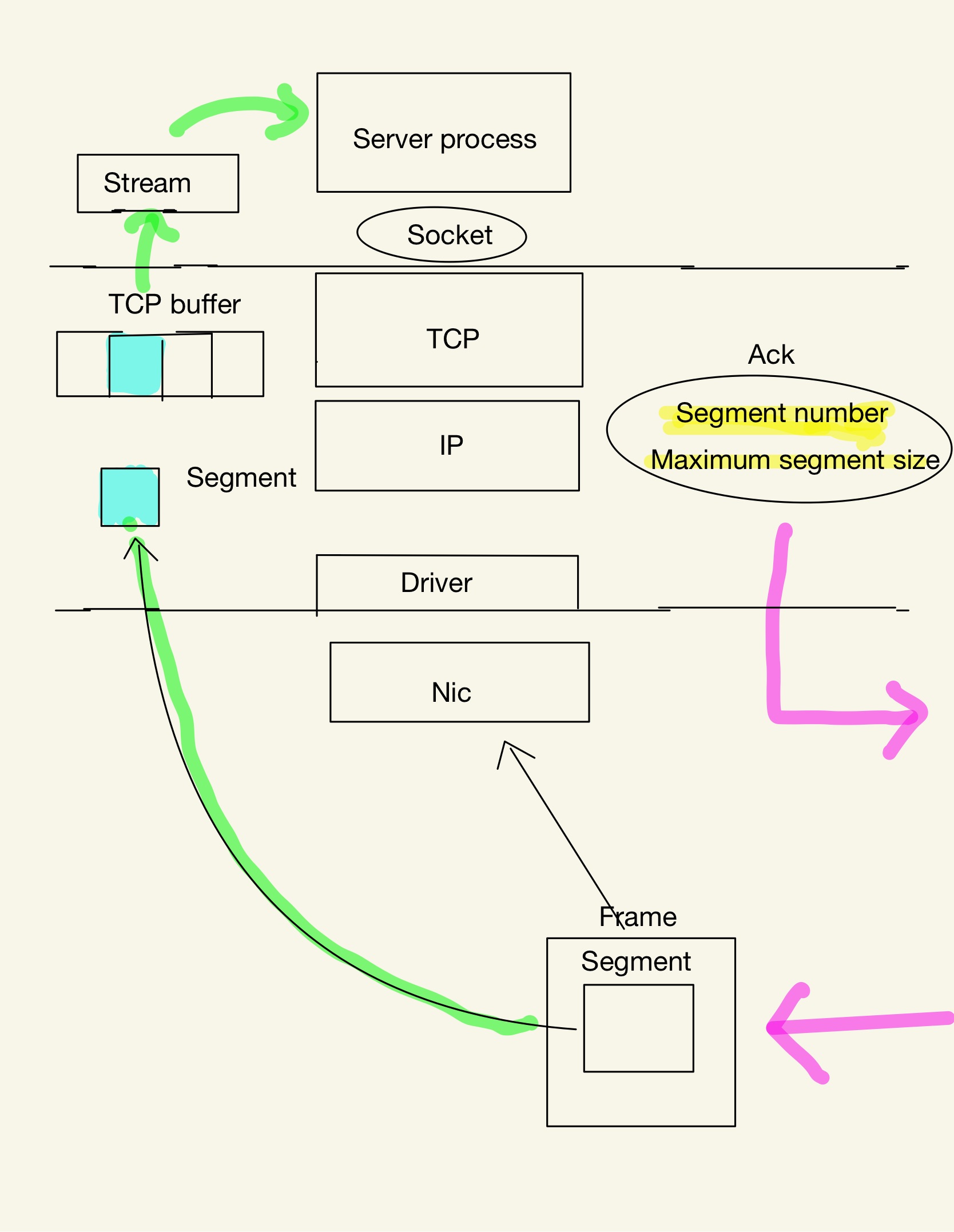 - TCP 계층은 세그먼트를 TCP 수신 버퍼에 저장합니다.