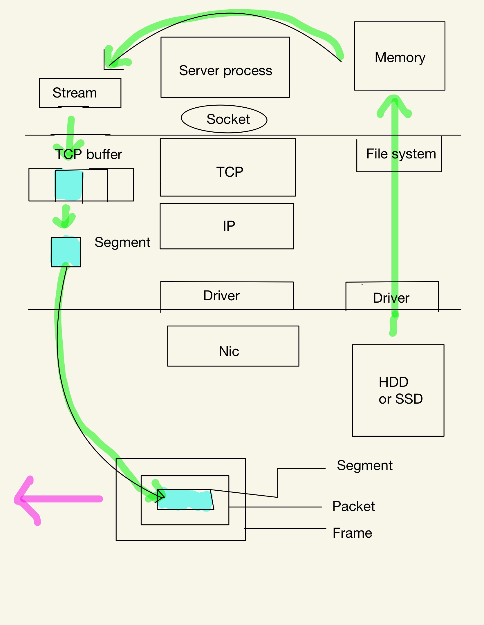 - 서버: 데이터를 64KB씩 잘라서 소켓 → TCP 버퍼 → NIC → 네트워크