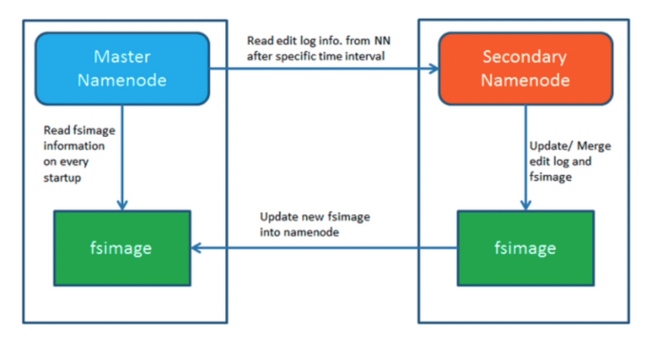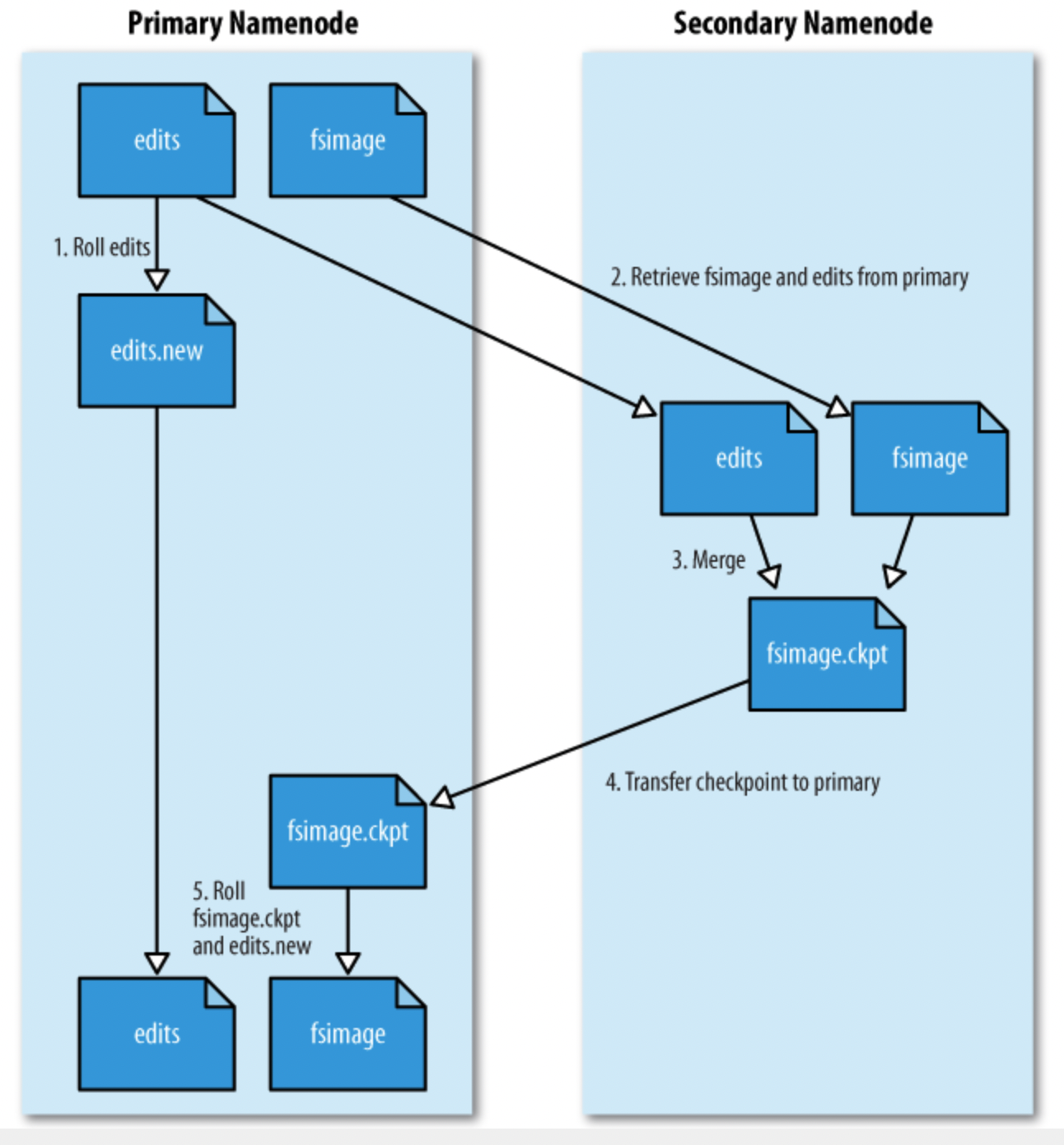 세컨더리 네임노드는 주기적으로 네임노드로부터 저널 로그를 전달받아 로그 복사 작업을 수행합니다.