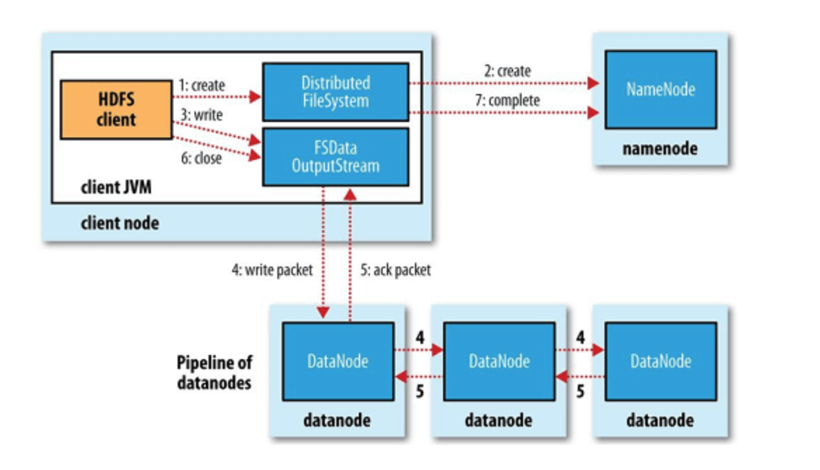 - 데이터 전송: 클라이언트는 실제 데이터를 작은 조각인 데이터 패킷(Packet)으로 분할하여 데이터노드에 전송