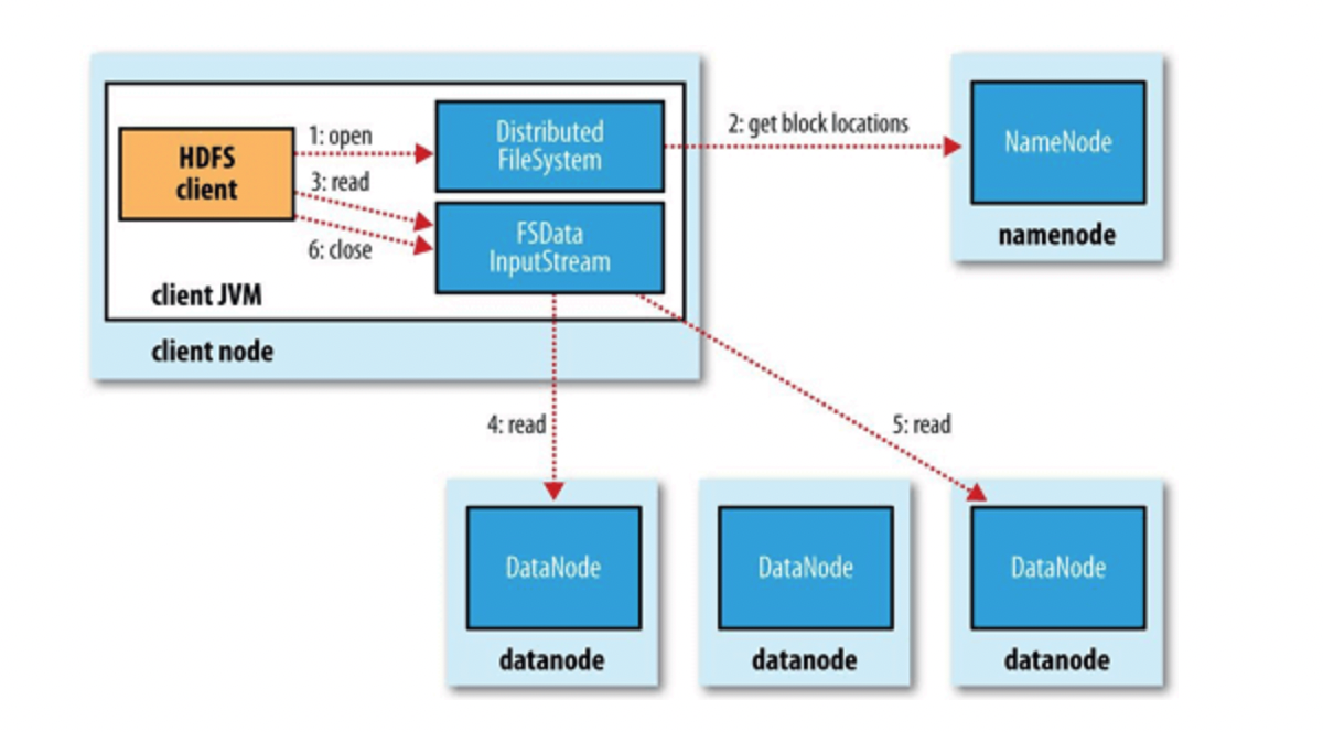 - 클라이언트는 네임노드에 접속하여 원하는 데이터가 존재하는 블록의 위치를 묻는다
