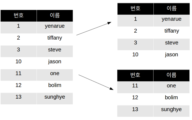 - 범위 파티셔닝 (Range Partitioning): 범위 파티셔닝은 키의 범위를 기준으로 데이터를 파티션에 분배합니다. 이 방식에서는 모든 파티션이 특정 범위의 키를 포함하도록 데이터를 분할합니다. 이는 정렬된 데이터에 대한 작업을 최적화할 때 유용합니다.